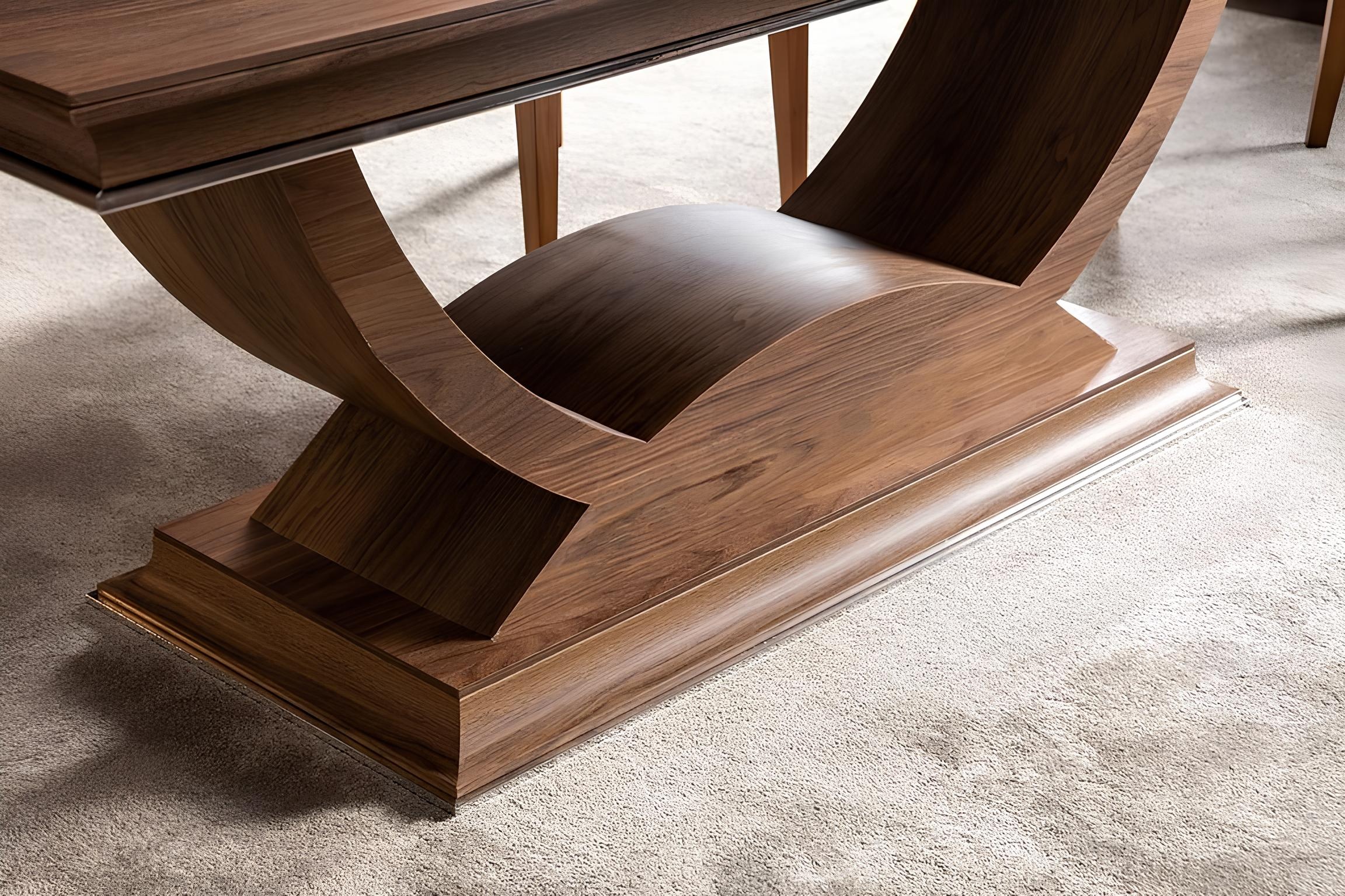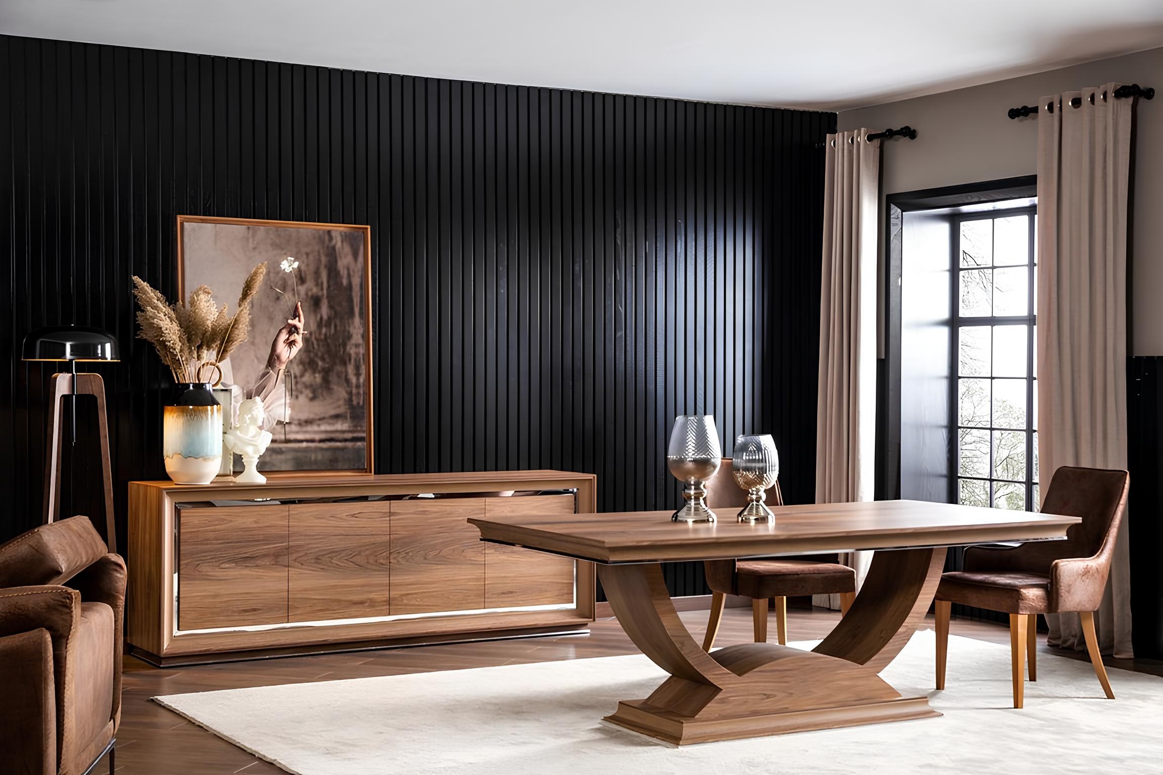 Elegantný jedálenský stôl s nohami predstavuje dokonalú harmóniu medzi štýlom a funkčnosťou. Jeho precízne spracovanie a hnedá farba vytvárajú atmosféru tepla a pohody vo vašej jedálni. Tento stôl, vyrobený z kvalitných materiálov, je navrhnutý tak, aby vydržal roky, pričom zachováva svoj nadčasový vzhľad. Štýlové nohy pridávajú na stabilite a elegancii, pričom sa stávajú stredobodom pozornosti pri každom jedle. S viac než 20-ročnou tradíciou v oblasti luxusného nábytku, tento stôl nie je len kusom nábytku, ale aj symbolom exkluzívneho životného štýlu. Vytvorte si priestor, ktorý odráža vašu osobnosť a vkus.
