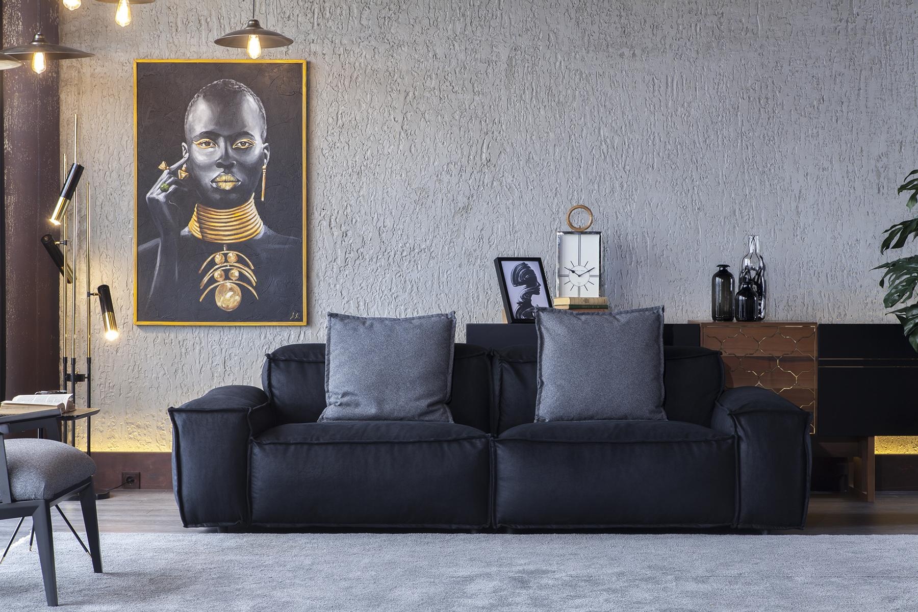 Sofa pre 3 osoby z pohodlného materiálu do obývacej izby predstavuje dokonalú harmóniu medzi eleganciou a komfortom. Jej nadčasový dizajn v čiernej farbe z kvalitného polyesteru dodáva interiéru sofistikovanosť a luxus. Široké, jemne zaoblené operadlá a precízne prešitie vytvárajú prostredie, v ktorom sa snúbi štýl s pohodlím. Táto pohovka, navrhnutá s ohľadom na najvyššie štandardy, je ideálnou voľbou pre tých, ktorí si potrpia na exkluzivitu a kvalitu. S viac ako 20-ročnou tradíciou v oblasti luxusného nábytku, ponúkame široký výber dizajnov, ktoré transformujú každý domov na oázu pohody a vkusu.