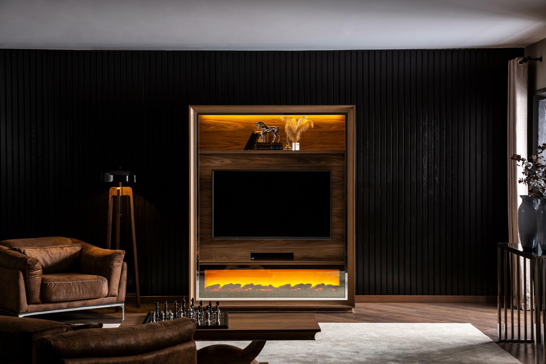 Luxusná stena do obývačky s krbom a konferenčným stolíkom