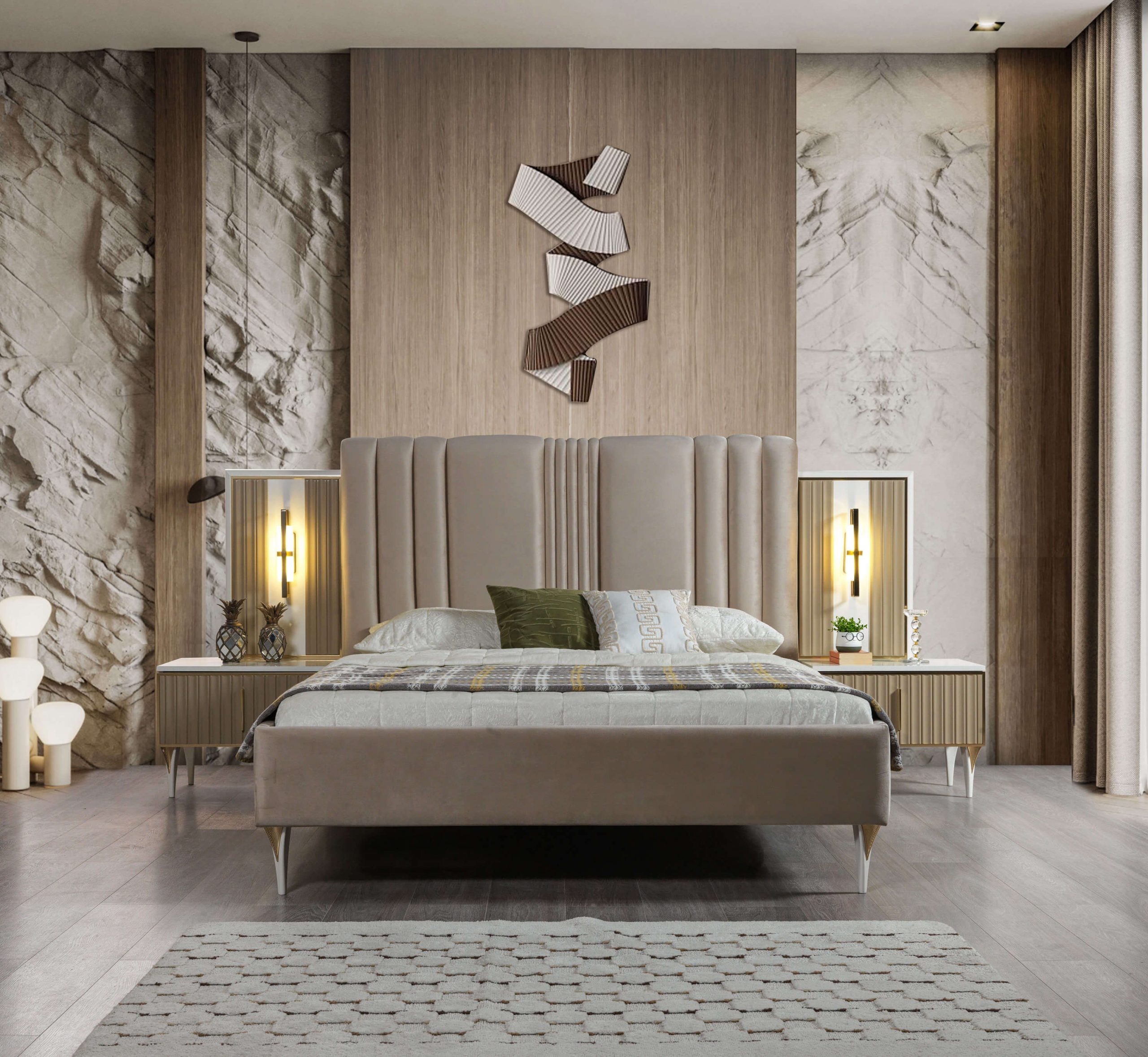 Elegantný 3-dielny nábytkový set s posteľou a nočnou lampou je zhmotnením luxusu a majstrovského remeselného spracovania. Béžová farba sa harmonicky prelína s noblesným dizajnom, čo vytvára ideálny kontrast pre moderné a nadčasové interiéry. Posteľ, s precíznym detailom a pohodlným matracom, ponúka dokonalý priestor pre odpočinok a regeneráciu. Nočná lampa, elegantne umiestnená na nočnom stolíku, poskytuje jemné osvetlenie a dopĺňa atmosféru pokoja. Tento set, vyrobený s dôrazom na kvalitu a estetiku, je ideálnou voľbou pre tých, ktorí túžia po výnimočnom a štýlovom životnom priestore. Užite si luxus, ktorý pretrvá.