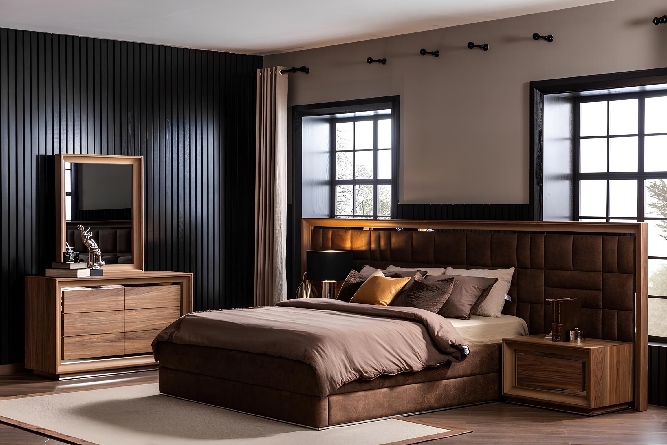 Kompletná spálňová súprava s posteľou a luxusnými nočnými stolíkmi v hnedej farbe je dokonalým vyjadrením elegancie a rafinovanosti. Každý detail tejto súpravy je starostlivo navrhnutý tak, aby vytvoril harmonické prostredie, ktoré pozdvihne vašu spálňu na úroveň exkluzívneho útočiska. Hnedá farba, symbol tepla a komfortu, v kombinácii s kvalitnými materiálmi, zabezpečuje trvácnosť a nadčasovosť. Tento kus nábytku nielenže poskytuje neporovnateľnú funkčnosť, ale aj estetický zážitok, ktorý osloví aj tých najnáročnejších. Investícia do tejto súpravy je investíciou do luxusného životného štýlu, ktorý si zaslúžite.