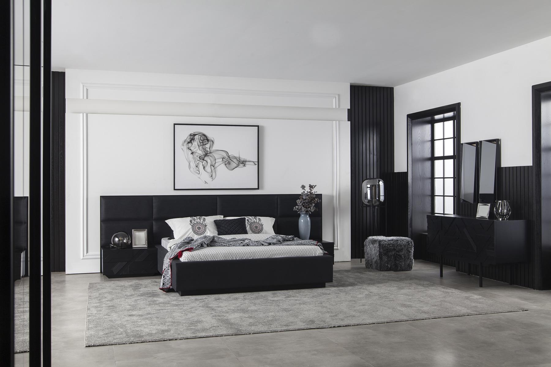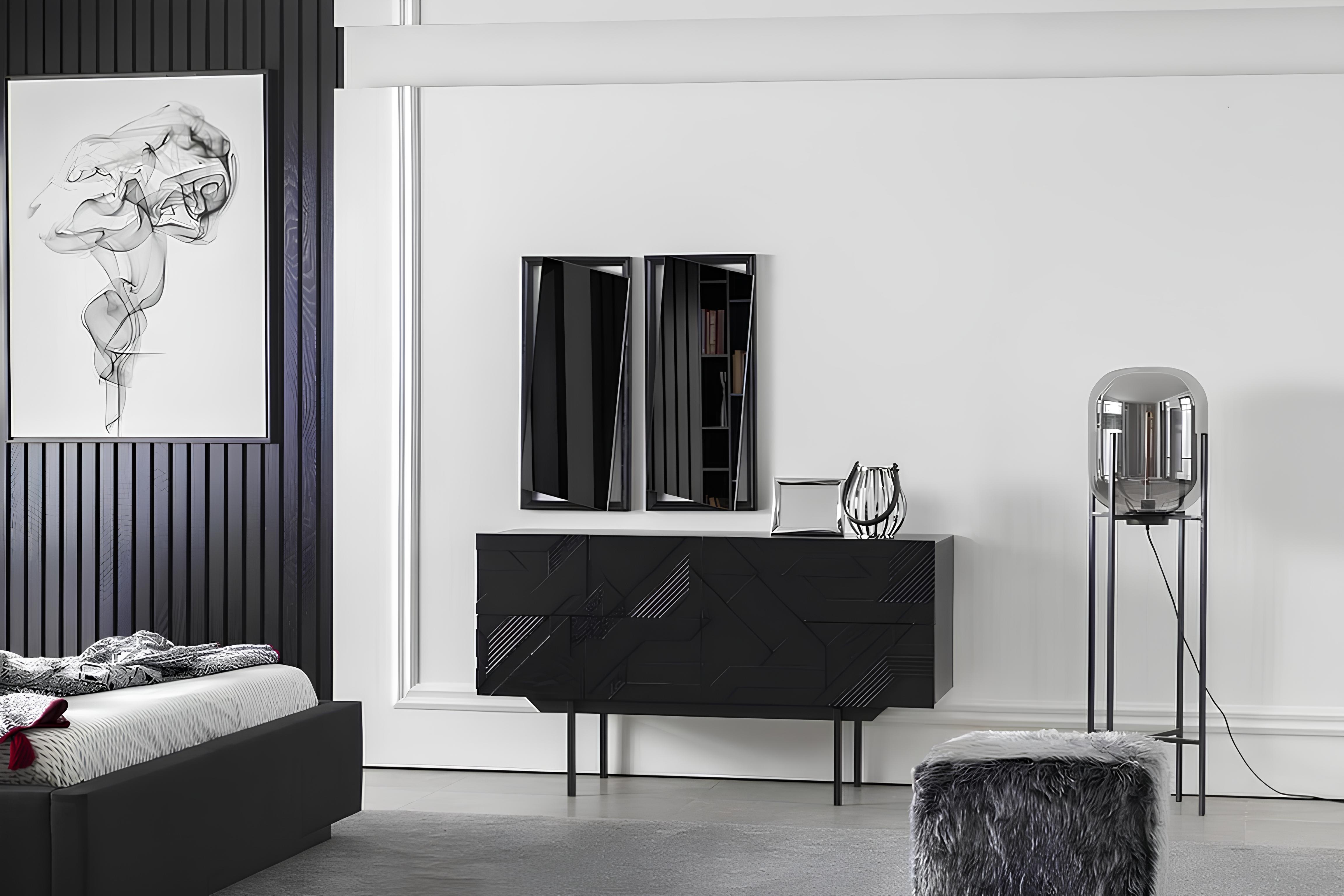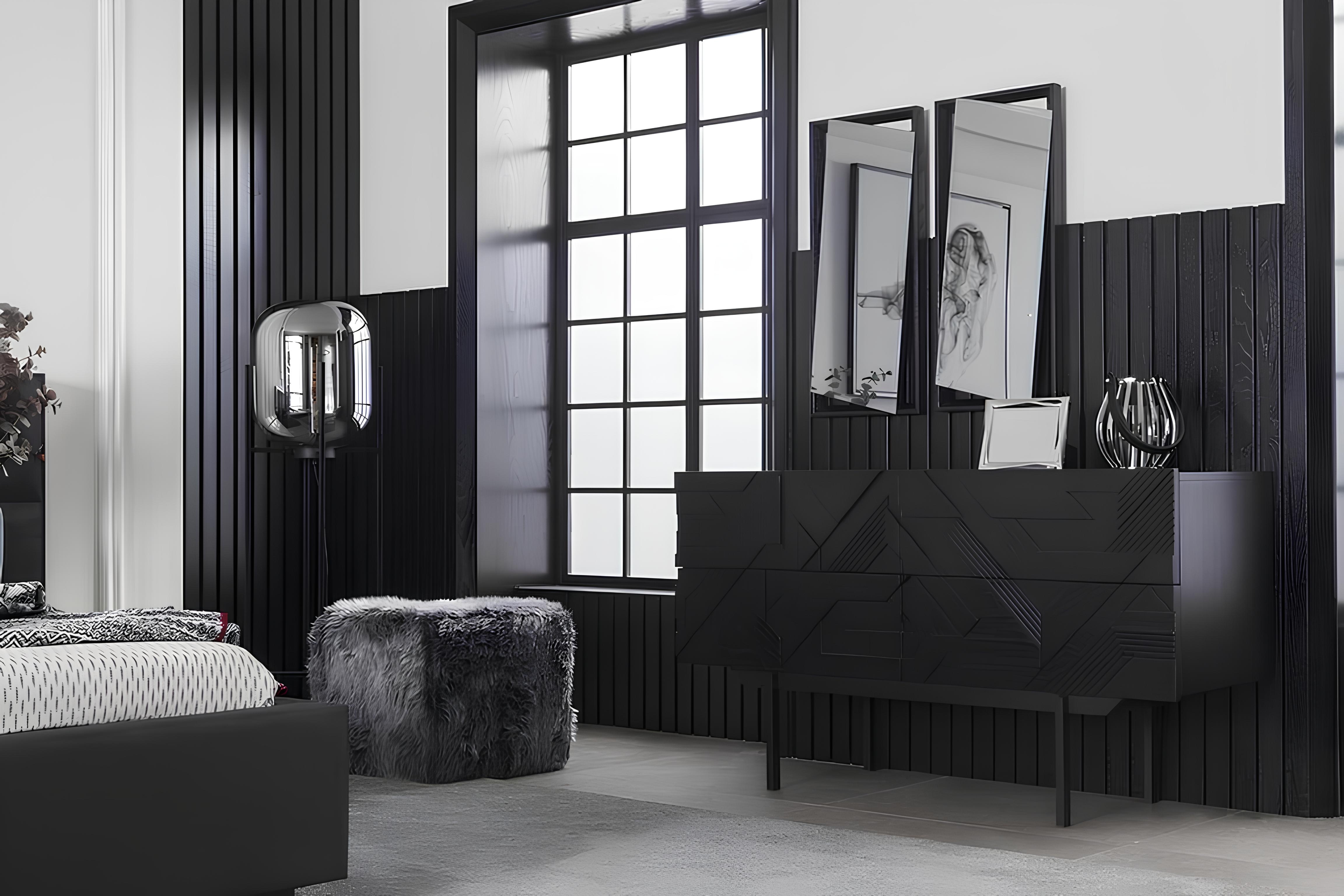 Luxusná spálňa s nábytkom pozostávajúcim z elegantnej skrine, dvoch nočných stolíkov a piatich dielov predstavuje dokonalú harmóniu štýlu a funkčnosti. Vyrobená z prémiového čierneho polyesteru, táto kolekcia dodáva každému interiéru nádych sofistikovanosti. Precízne spracovanie a nadčasový dizajn sú zárukou, že tento nábytok sa stane centrom pozornosti vo vašej spálni. Spojenie kvalitných materiálov a estetického výrazu vytvára exkluzívnu atmosféru, ktorá odráža váš vkus a životný štýl. Investícia do tejto spálne je investíciou do luxusu, ktorý premení vaše bývanie na oázu pokoja a elegance.