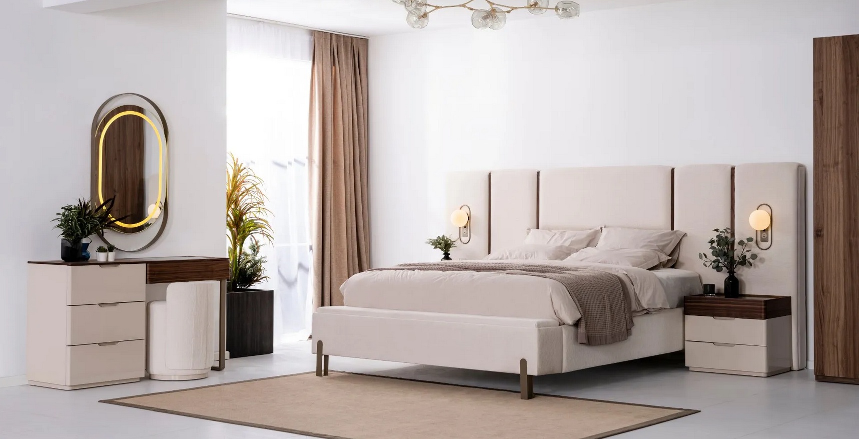 Popoln a luxusný nábytkový set do spálne s posteľou, lavicou a 2 nočnými stolíkmi je dokonalým vyjadrením elegancie a komfortu. Vytvorený z kvalitnej béžovej textílie, tento set ponúka nielen estetickú hodnotu, ale aj maximálne pohodlie. Posteľ s prepracovaným dizajnom poskytuje ideálne prostredie pre odpočinok, zatiaľ čo lavica a nočné stolíky dopĺňajú celkový vzhľad a funkčnosť miestnosti. Každý kus je starostlivo navrhnutý tak, aby vnesol do vášho domova pocit luxusu a výnimočnosti. S viac ako 20-ročnými skúsenosťami v oblasti luxusného nábytku, tento set je ideálnou voľbou pre tých, ktorí si cení výnimočný štýl a kvalitu.