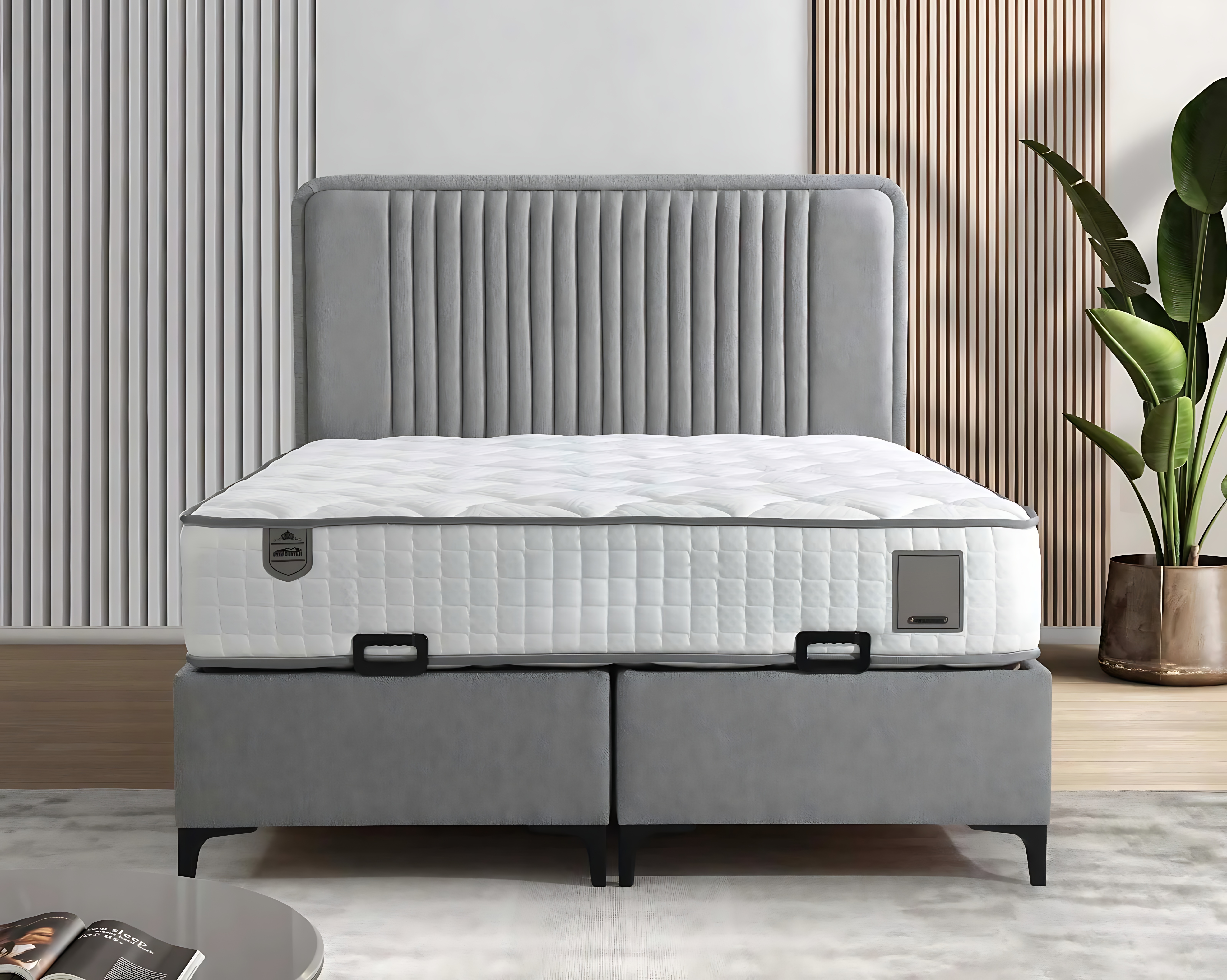 Elegantná posteľ z látky a dreva s matracom predstavuje dokonalú harmóniu medzi luxusom a pohodlím. Jej sofistikovaný dizajn v jemnej sivej farbe a kvalitné drevené detaily vytvárajú jedinečný estetický zážitok, ktorý obohatí každý interiér. Matrac, vyrobený z prémiových materiálov, zaručuje optimálnu podporu a pohodlie, čím zabezpečuje skutočne osviežujúci spánok. S touto posteľou sa stáva vaše spálne oázou pokoja a štýlu, odrážajúc vašu náročnosť a chuť na výnimočnosť. Vytvorte si exkluzívnu atmosféru vo svojom domove s kusom nábytku, ktorý je synonymom pre eleganciu a trvácnosť.