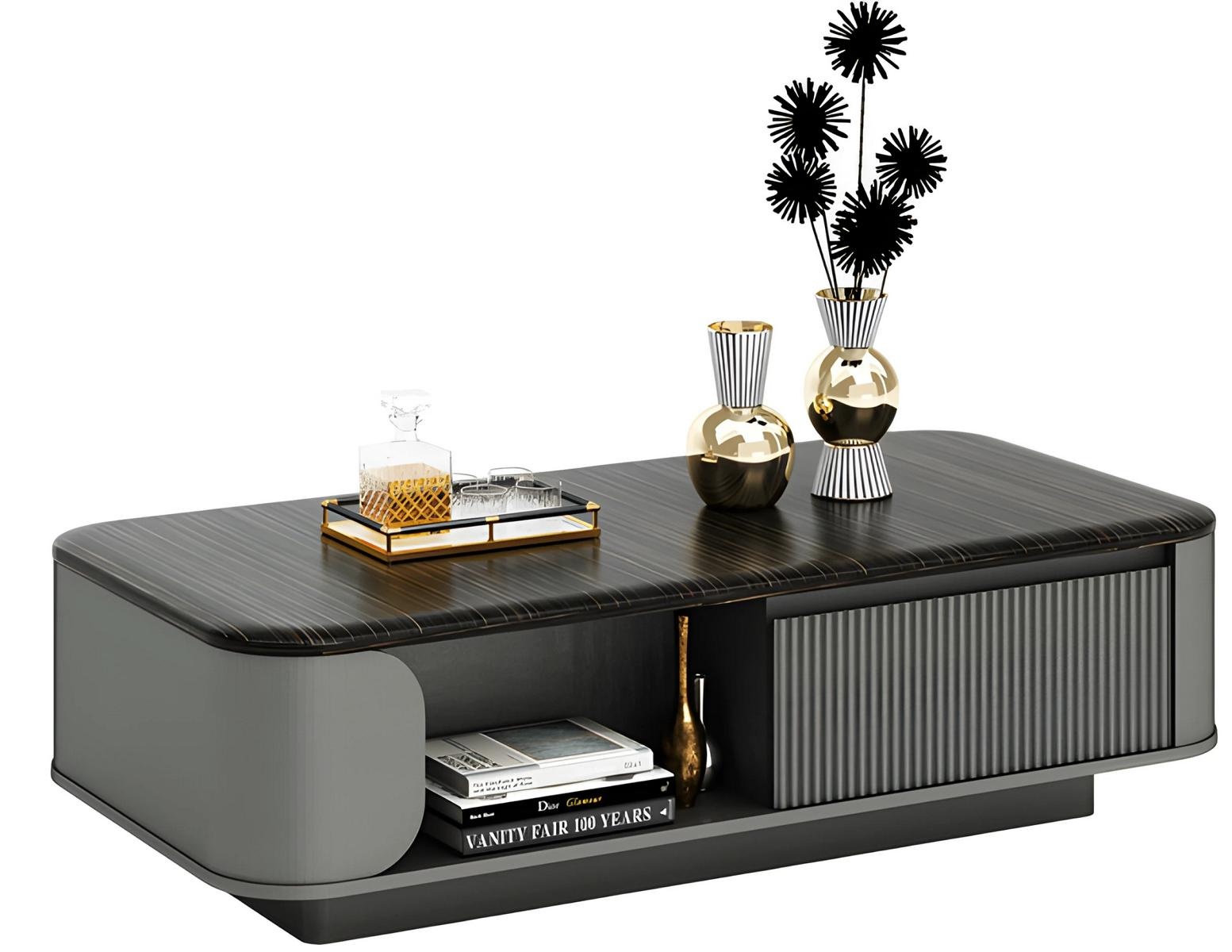 Moderná kávová miza s elegantným dizajnom a čiernou doskou, plus otvorené police