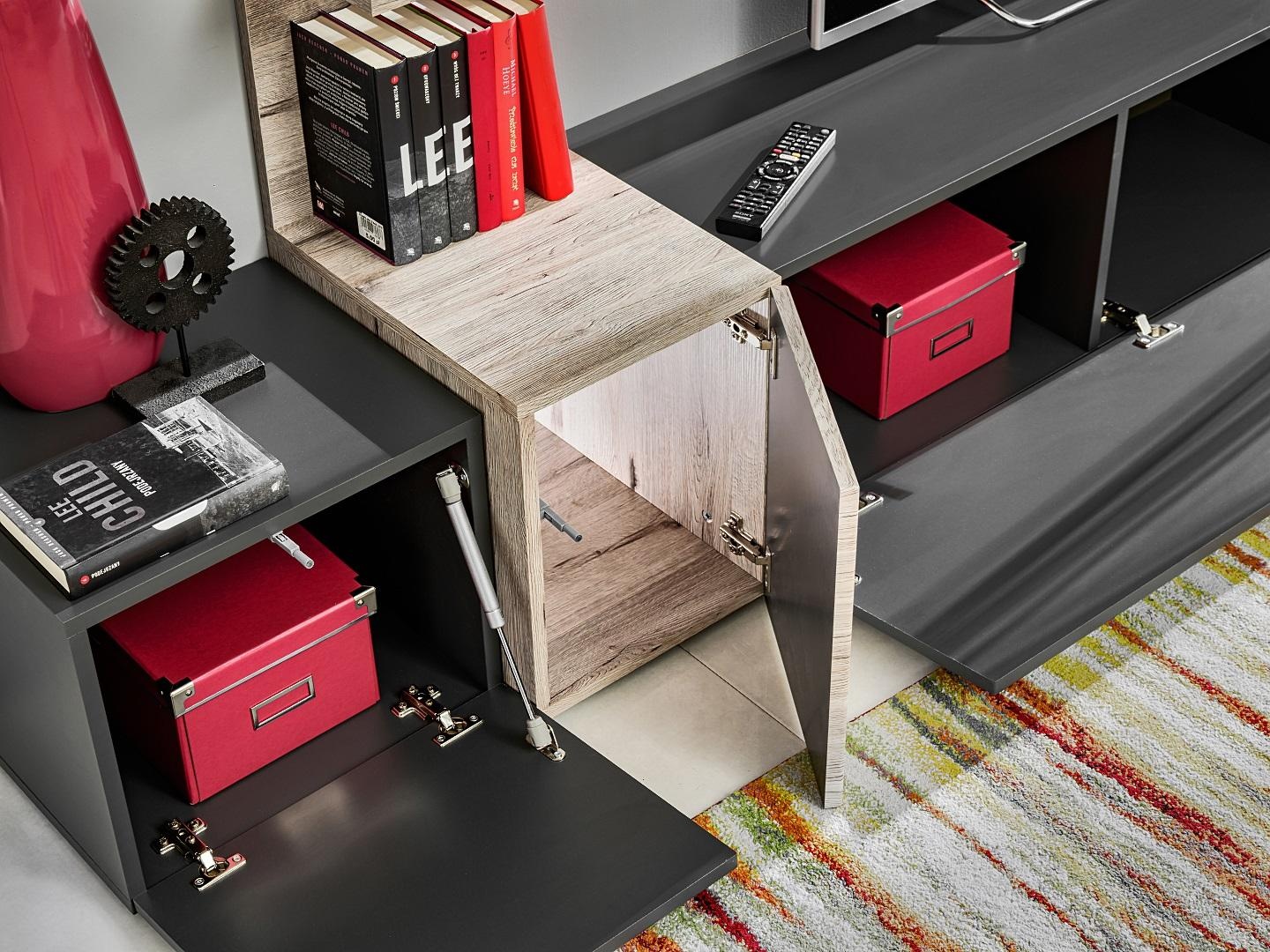 Moderná stenná jednotka do obývacej izby so sivými policami a televíznym stojanom | xlnabytok.sk